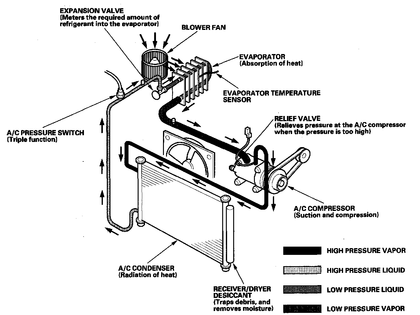 System DescriptionThe air conditioning system removes heat from the passenger compartment by circulating refrigerant through the system.