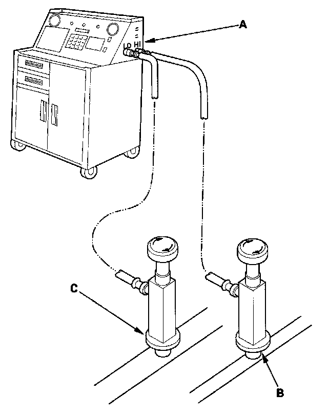 2. Connect an R-134a refrigerant recovery/recycling/charging station (A) to the high-pressure service port (B) and the low-pressure service port (C), as shown, following the equipment manufacturer's instructions. Evacuate the system.
