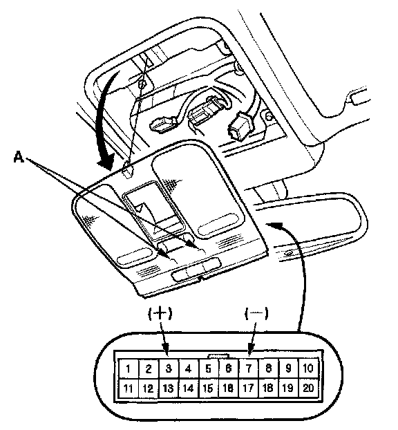 2. Connect the roof console connector terminal No. 3 to battery power and terminal No. 7 to body ground. The ambient lights (A) should turn on. If they do not turn on, replace the roof console.