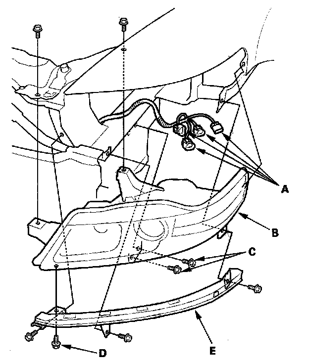 5. Remove the bolt (D) and the corner upper beam (E) from the headlight.