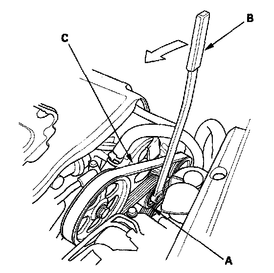2. Move the auto-tensioner (A) with the belt tension release tool (B) to relieve tension from the drive belt (C), then remove the drive belt.