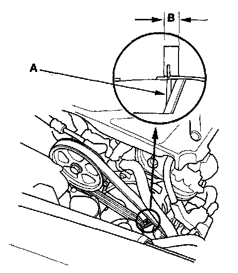 3. Check that the auto-tensioner indicator (A) is within the standard range (B) as shown. If it is out of the standard range, replace the drive belt.