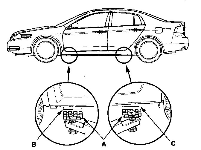 1. Position the hoist lift blocks (A) under the vehicle's front support points (B) and rear support points (C).