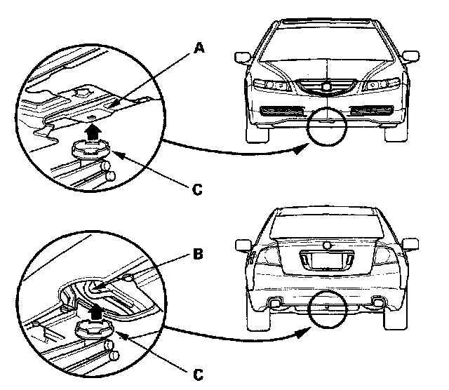 3. Position the floor jack under the front jacking bracket (A) or rear jacking bracket (B). Center the jacking bracket in the jack lift platform (C), and jack up the vehicle high enough to fit the safety stands under it.