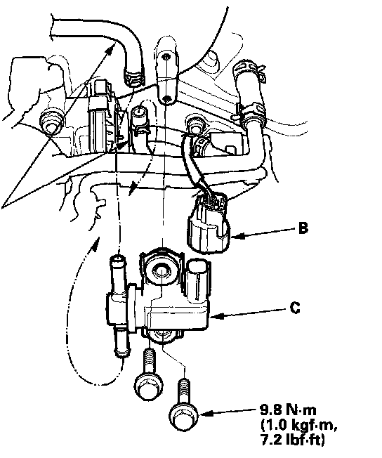 EVAP Canister Purge Valve Replacement1. Disconnect the hoses (A) and the EVAP canister purge valve 2P connector (B).