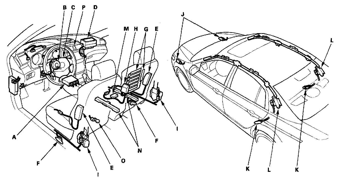 The side curtain airbags (L) are in each side of the roof. They help protect the head of the driver, front passenger, and passengers in the rear outer seats during a moderate to severe side impact. Side impact sensors (first) (F) in each front door sill, side impact sensors (second) (K) in each rear door sill, and the SRS unit detect such an impact and instantly inflate the driver's or the passenger's side curtain airbag. A side impact causes the side curtain airbag and the side airbag on the impacted side to deploy at the same time.