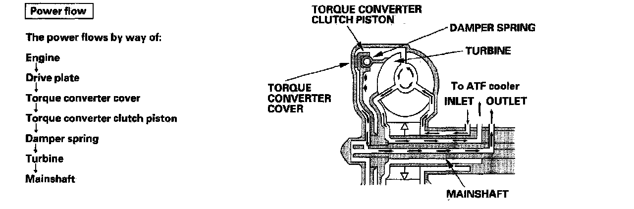 Lock-up SystemThe lock-up mechanism of the torque converter clutch operates in the D position (2nd, 3rd, 4th, and 5th) and the D position with sequential sportshift mode (3rd, 4th, and 5th). The pressurized fluid is drained from the back of the torque converter through a fluid passage, causing the torque converter clutch piston to be held against the torque converter cover. As this takes place, the mainshaft rotates at the same speed as the engine crankshaft. Together with the hydraulic control, the PCM optimizes the timing and amount of the lock-up mechanism. When the torque converter clutch solenoid valve activates, modulator pressure changes to switch lock-up ON and OFF. The lock-up control valve and the lock-up timing valve control the amount of lock-up according to A/T clutch pressure control solenoid valve C. The torque converter clutch solenoid valve is mounted on the torque converter housing, and A/T clutch pressure control solenoid valve C is mounted on the transmission housing. They are controlled by the PCM.