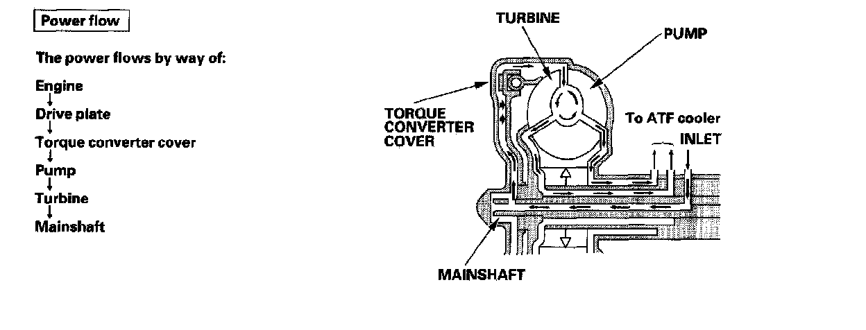 Fluid entered from the chamber between the torque converter cover and the torque converter clutch piston passes through the torque converter and goes out from the chambers between the turbine and the stator, and between the pump and the stator. As a result, the torque converter clutch piston moves away from the torque converter, and the torque converter lock-up clutch is released; torque converter clutch lock-up is OFF.