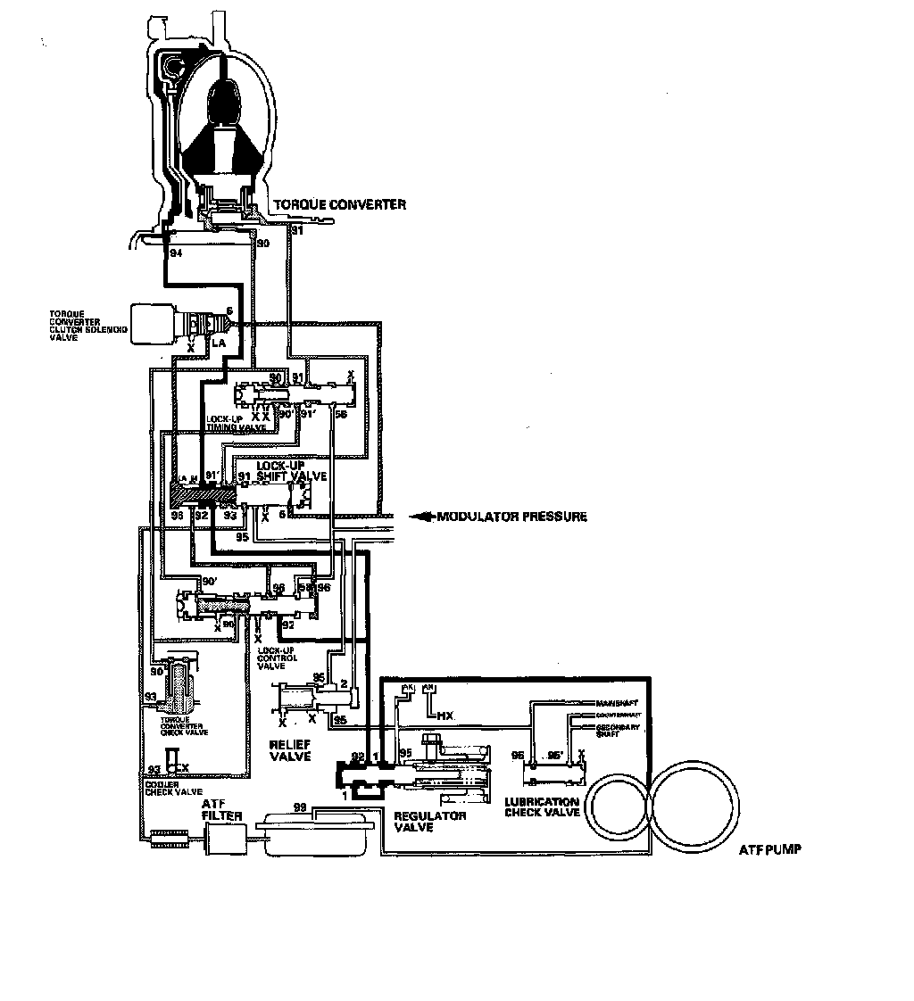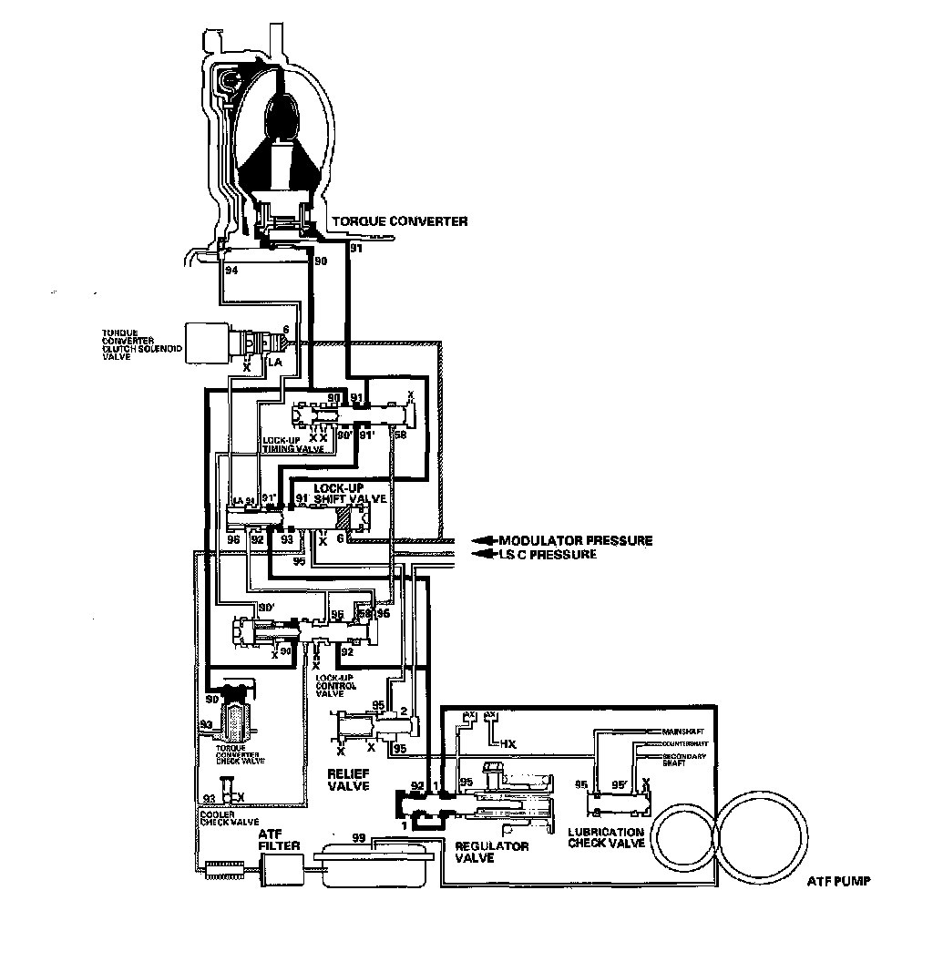 The torque converter clutch solenoid valve is turned OFF by the PCM. The lock-up shift valve receives LC pressure (LA) on the left side, and modulator pressure (6) on the right side. The lock-up shift valve is in the right side to uncover the port leading torque converter pressure (92) to the left side of the torque converter. Torque converter pressure (92) becomes torque converter pressure (94), and enters into the left side of the torque converter to disengage the torque converter clutch. The torque converter clutch is OFF.