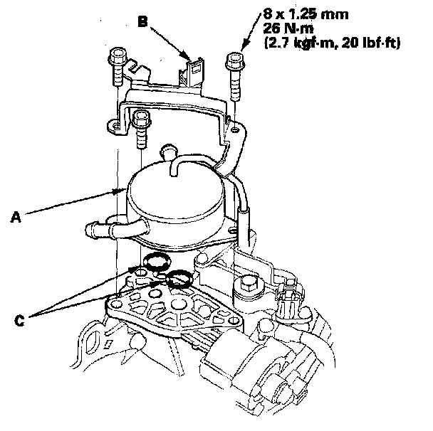 9. Install the new ATF warmer with the new O-rings (C) and the bracket. Do not pinch the O-rings.