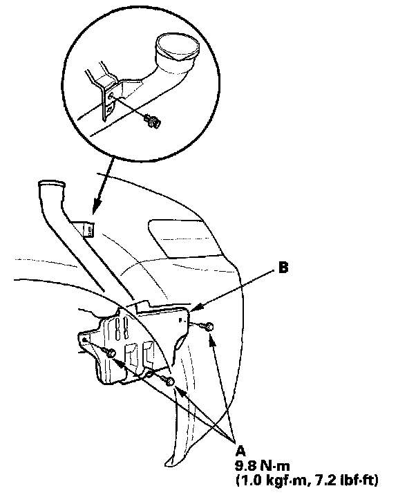 3. Remove the clip and three bolts (A), then remove the washer reservoir (B).