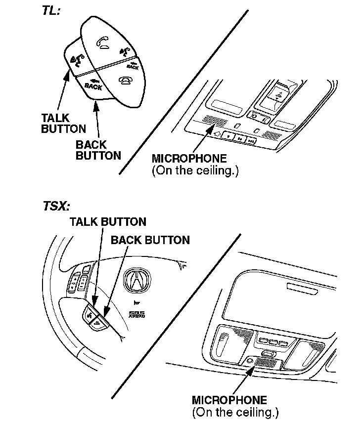 The voice control system consists of the TALK and BACK buttons on the steering wheel, and a microphone on the ceiling. The audio speakers are used for voice prompts.