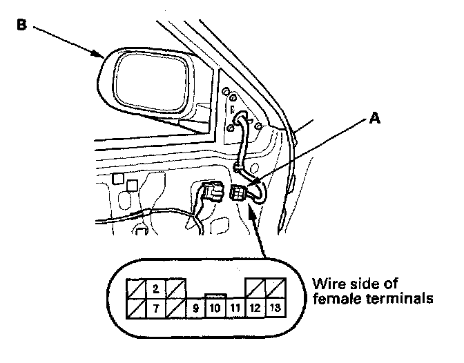 2. Disconnect the 13P connector (A) from the power mirror actuator (B).