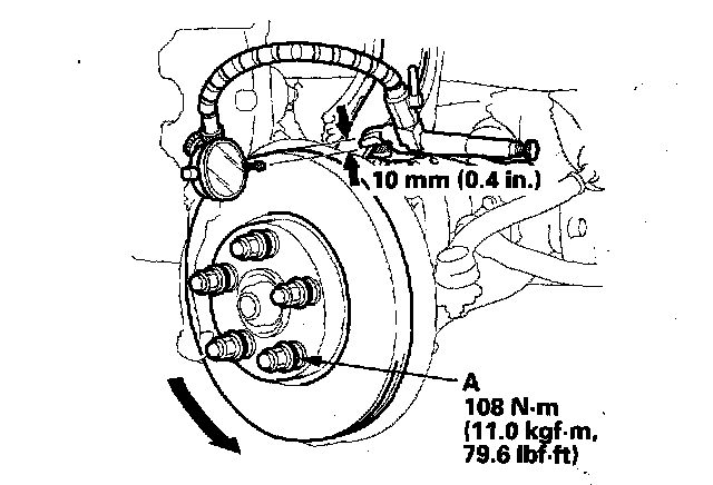 5. Set up the dial gauge against the brake disc as shown, and measure the runout at 10 mm (0.4 inch) from the outer edge of the disc.
