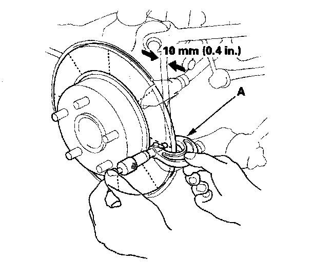5. Set up the dial gauge against the brake disc as shown, and measure the runout at 10 mm (0.4 inch) from the outer edge of the disc.