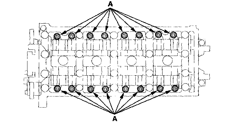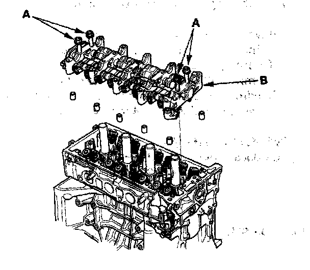 3. Remove the camshaft holder bolts. To prevent damaging the camshafts, unscrew the bolts two turns at a time, in a crisscross pattern.