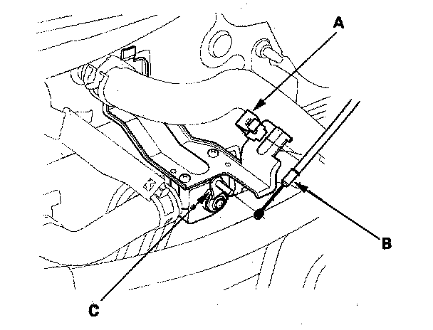 Heater Valve Cable Adjustment1. From under the hood, open the cable clamp (A), then disconnect the heater valve cable (B) from the heater valve arm (C).