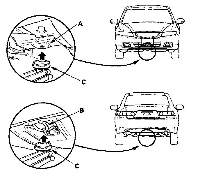 3. Position the floor jack under the front jacking bracket (A) or rear jacking bracket (B), center the jacking bracket in the jack lift platform (C), and jack up the vehicle high enough to fit the safety stands under it.