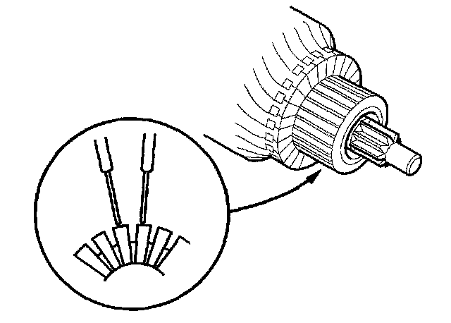 8. Check for continuity between the segments of the commutator. If there is an open circuit between any segments, replace the armature.