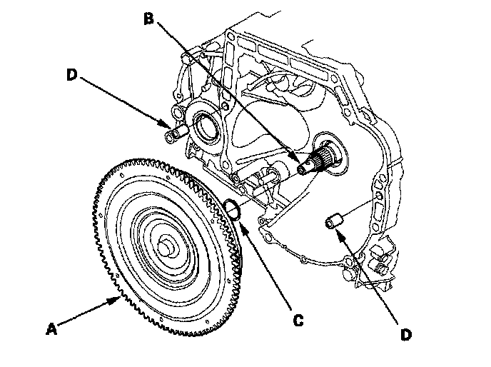 3. Install the 14 x 20 mm dowel pins (D) in the torque converter housing.