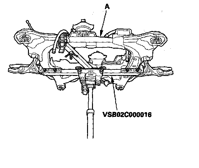 17. Support the front subframe (A) with the special tool and a jack, and lift it up to body.