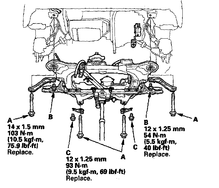 18. Loosely install the new subframe mounting bolts (A), and stiffener mounting bolts (B) (C).