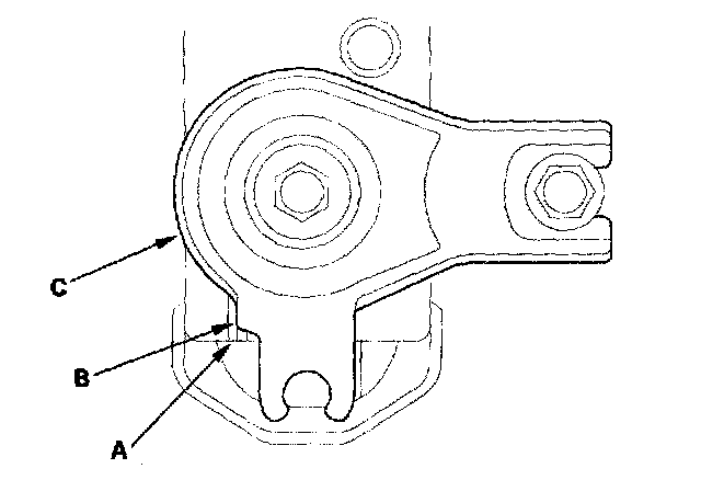34. Install the front mount stop (B) and vacuum hose clamp bracket (C).