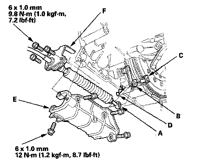 24. Install the shift cable cover (E), then secure the shift cable holder (F) to the shift cable cover with the three bolts.