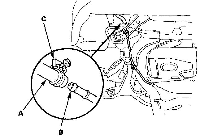 27. Connect the power steering fluid hose (A) to the power steering fluid line (B), and secure the hose with the clamp (C).
