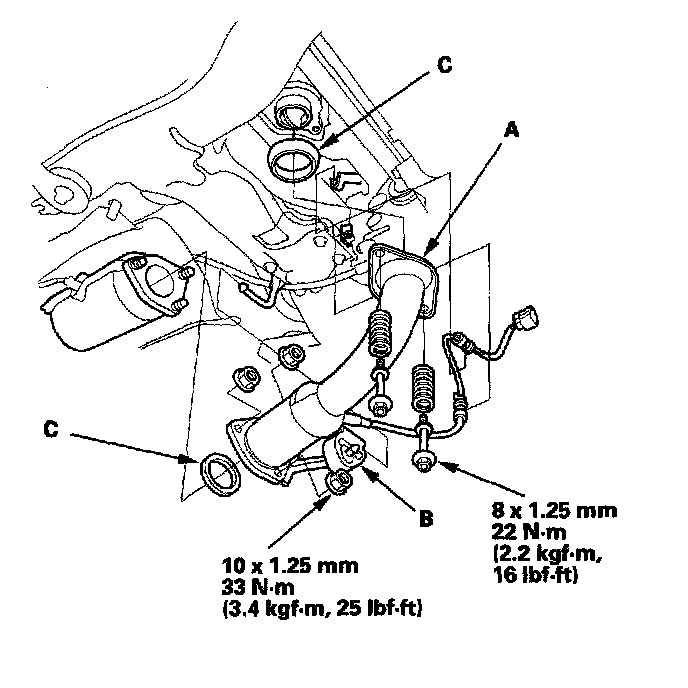 29. Install the exhaust pipe A, its mount rubber (B), and new gaskets (C).
