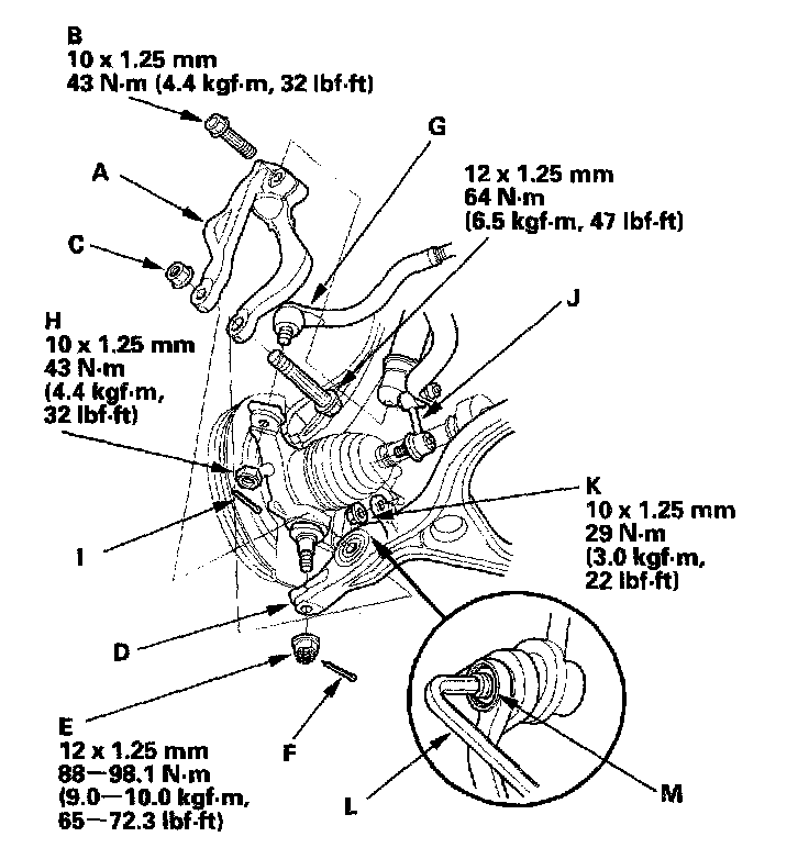 32. Install the stabilizer links (J) to the lower arms, and install the nuts (K). Insert a 6 mm Allen wrench (L) in the ball joint pin (M), and tighten the nuts.