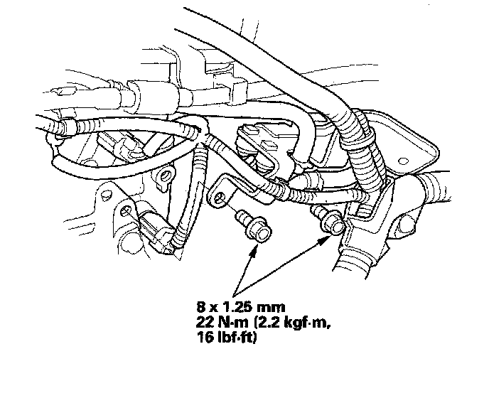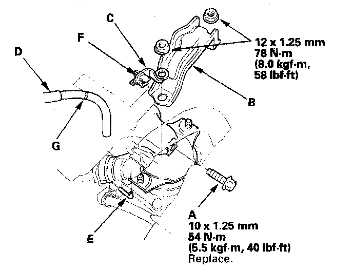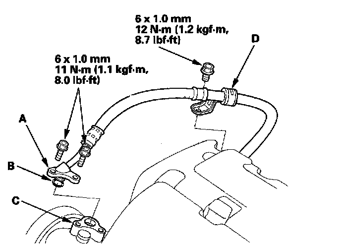 52. Install the power steering pump outlet line (A) with a new O-ring (B) to the pump (C), and secure the hose clamp (D) with the bolt.