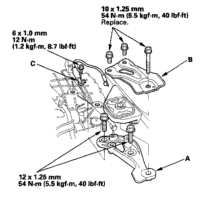 41. Install the transmission upper mount bracket (A), transmission upper mount bracket plate (B), and ground cable (C).