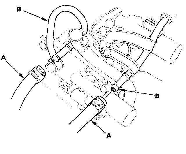 44. Connect the ATF cooler hoses (A) to the ATF cooler lines (B), and secure the hoses with the clips.