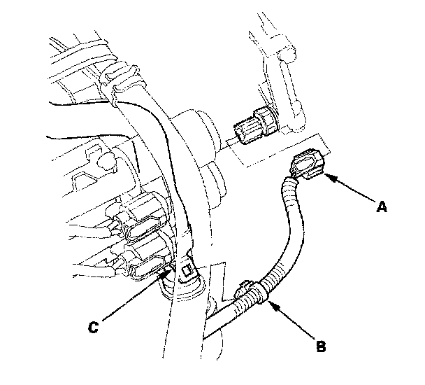 45. Connect the 3rd clutch transmission fluid pressure switch connector (A), and install the harness clamp (B) on the clamp bracket (C).