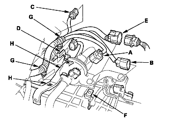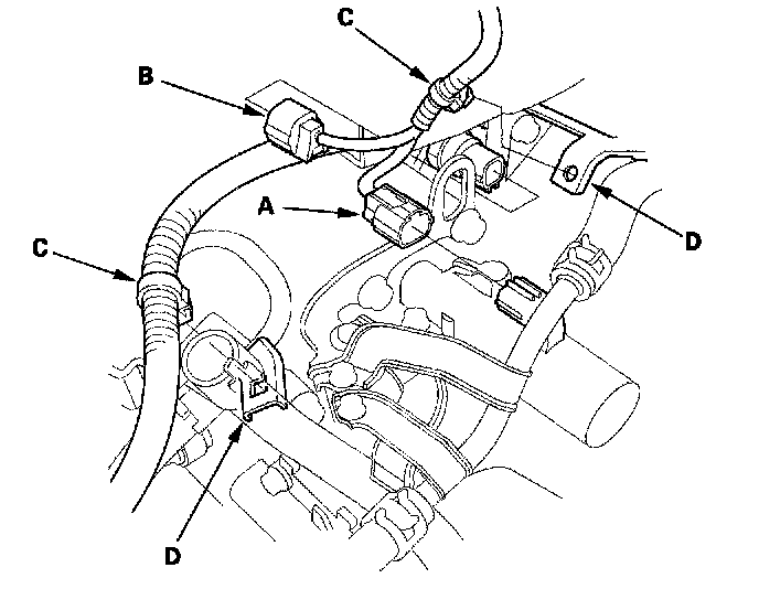 51. Install the A/T clutch pressure control solenoid valve A connector and 2nd clutch transmission fluid pressure switch connector (B), and install the harness clamps (C) on the harness clamp brackets (D).