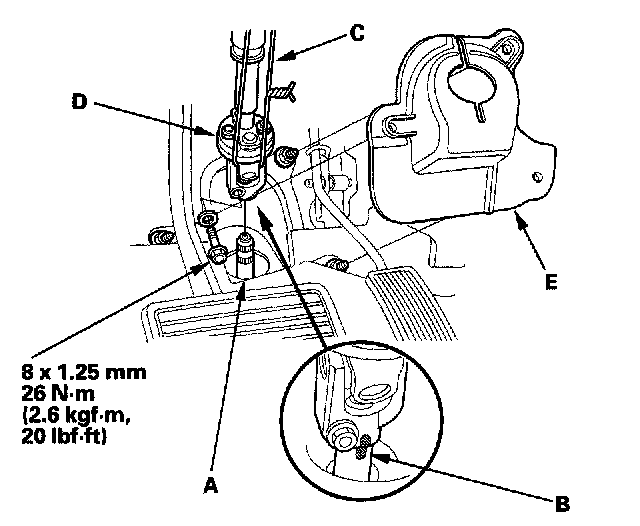 23. Attach the shift cable end (A) to the control lever (B), then insert the control pin (C) into the control lever hole through the shift cable end, and secure the control pin with the spring clip (D). Do not bend the shift cable excessively.