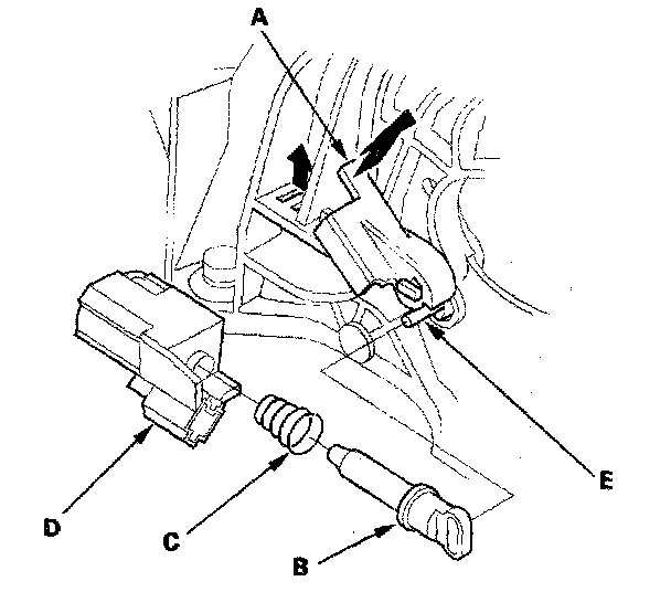 5. Install the new shift lock solenoid by aligning the joint of the shift lock solenoid plunger with the tip of the shift lock stop (E).