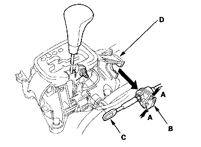 5. Press the holder lock release (A), and pull out the socket holder (B) on the shift cable (C) of the shift lever bracket base (D).