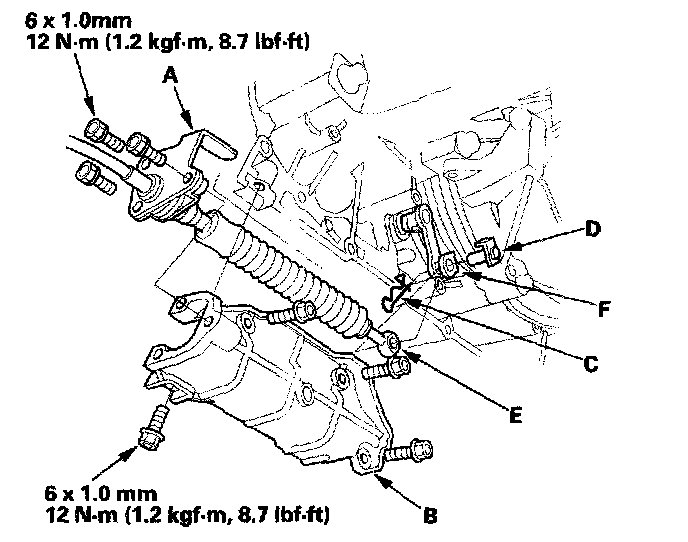 9. Remove the spring clip (C) and control pin (D), then separate the shift cable (E) from the control lever (F).