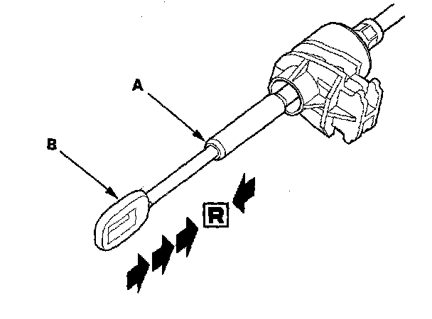 17. If necessary, push the shift cable until it stops, then release it. Pull the shift cable back one step so that the shift position is in R. Do not hold the shift cable guide (A) to adjust the shift cable (B).