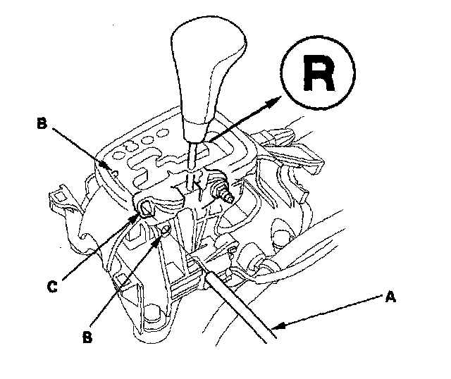 19. Insert a 6.0 mm (0.24 inch) pin (A) through the positioning hole (B) on the shift lever bracket base and into the positioning hole (C) on the shift lever. The shift lever is secured in the R position