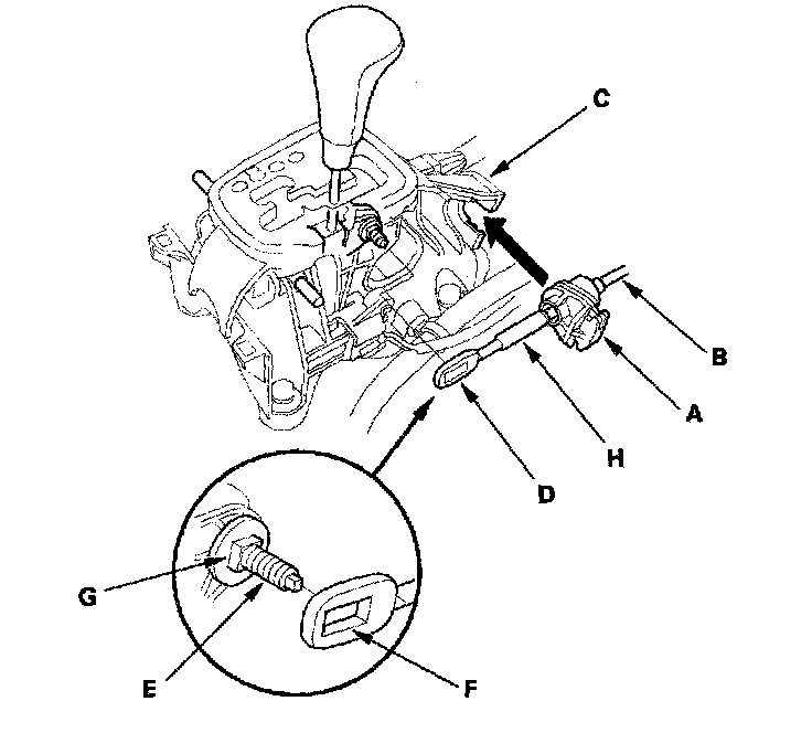 20. Align the socket holder (A) on the shift cable (B) with the slot in the bracket base (C), then slide the holder into base. Install the shift cable end (D) over the mounting stud (E) by aligning its square hole (F) with the square fitting (G) at the bottom of the stud. Push the holder until it snaps securely in place. Do not install the shift cable by holding the shift cable guide (H).