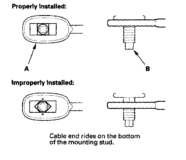 21. Verify that the shift cable end (A) is properly installed on the mounting stud (B).