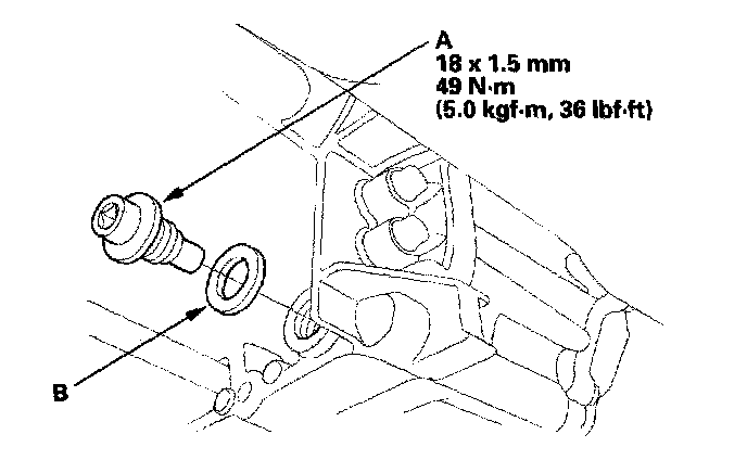 2. Remove the drain plug (A), and drain the automatic transmission fluid (ATF). Then reinstall the drain plug with a new sealing washer (B).
