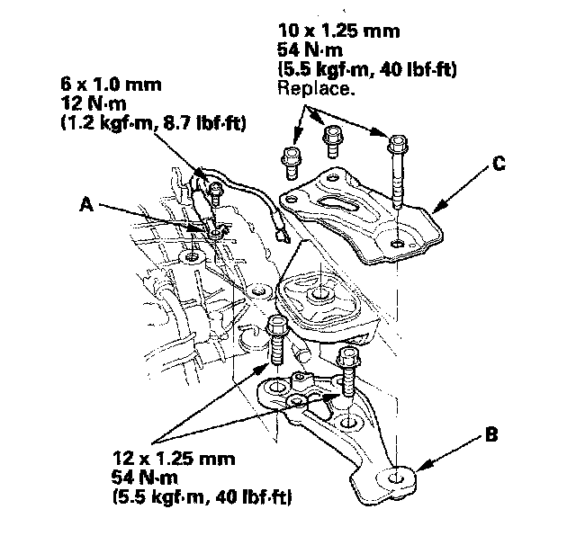 7. Remove the ground cable (A), transmission upper mount bracket (B), and bracket plate (C).