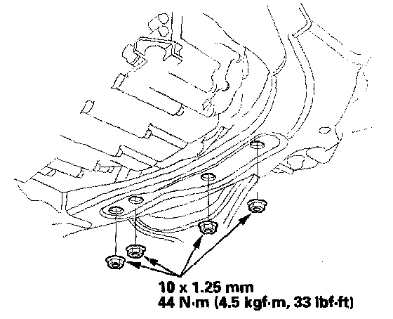 8. Place the transmission jack under the transmission, and remove the transmission lower mount nuts.