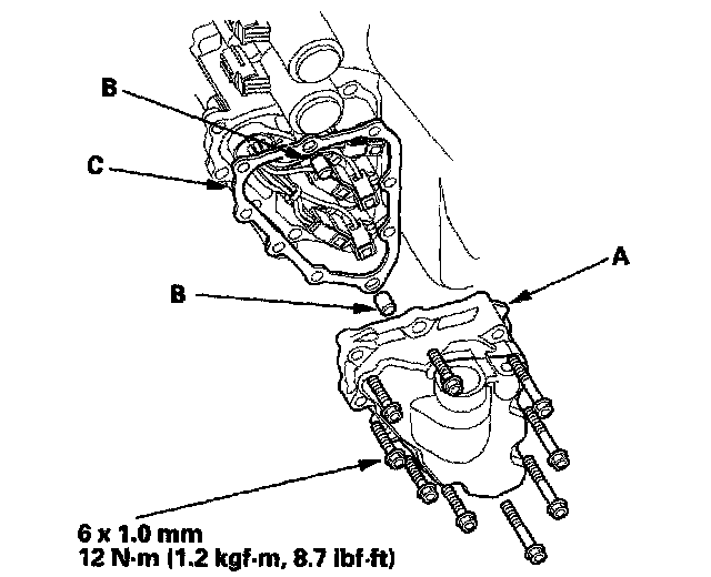 12. Remove the shift solenoid valve cover (A), dowel pins (B), and gasket (C).