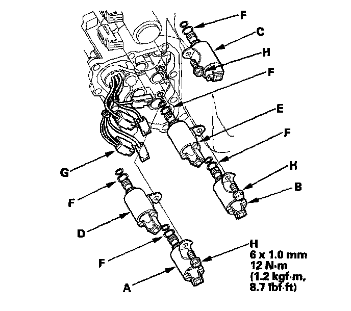 13. Disconnect the shift solenoid valve connectors remove the solenoid mounting bolts (H), then hold the solenoid valve body and remove the shift solenoid valves. Do not hold the connector to remove the shift solenoid valve.