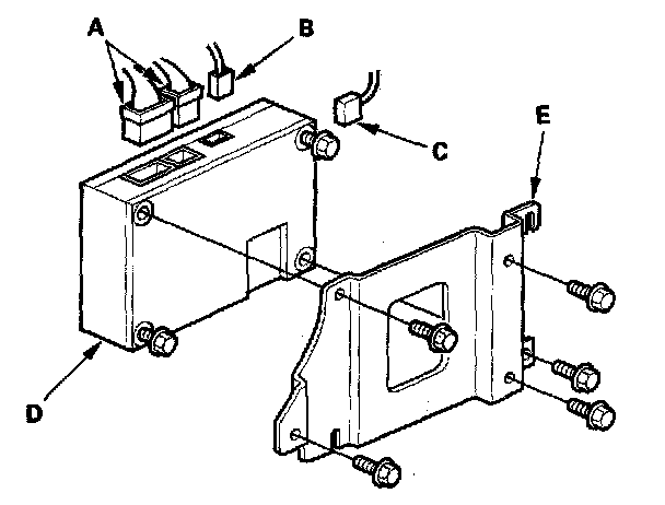 3. Loosen the bolts that secure the OnStar control unit and bracket (E) to the shift lever base assembly, then slide the control unit and bracket forward to remove it.